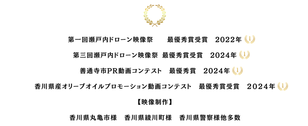 また2024年には善通寺市の魅力を伝えるPR動画コンテストで最優秀賞を受賞し、同年には香川県産のオリーブオイルプロモーション動画コンテストにおいて最高賞であるグランプリを受賞いたしました。